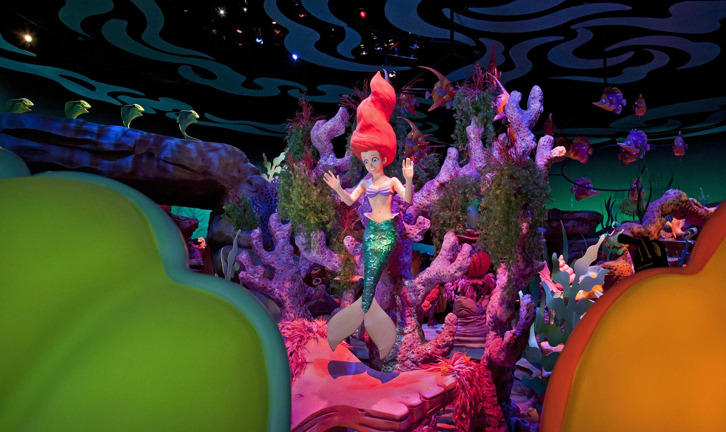 Em meio a tantas invenções e tecnologias de ponta nos parques de diversões, o The Little Mermaid Ariel’s Undersea Adventure é uma volta ao passado, uma atração estilo dark ride que leva os visitantes por dentro das principais cenas do filme. Após uma fila bem sem graça , imitando a entrada de um aquário do início do século (quem já foi na versão do Magic Kingdom vai ficar bem decepcionado aqui), entra-se em conchas que ficam em uma esteira, uma seguida da outra – sistema inventado para a The Haunted Mansion que aumenta, e muito, a capacidade de pessoas dentro de uma atração.